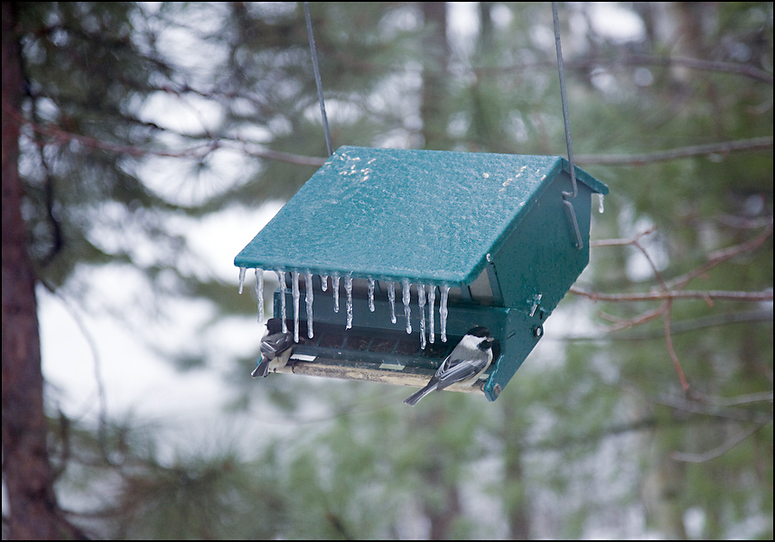 As with last year, it rained on the Christmas spirit. The birds are used to all kinds of weather and the major thing that they focus on is getting fed. These Chickadees are busy