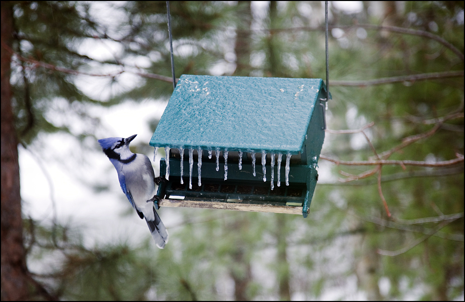 The Blue Jays have figured out the anti-squirrel feature of the feeder