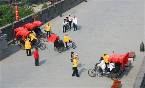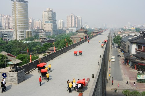 The Xi’an City Wall surrounds the old city. It is possible to walk, cycle or take a pedicab around the top of it.