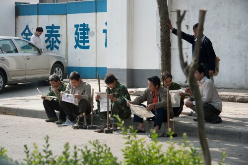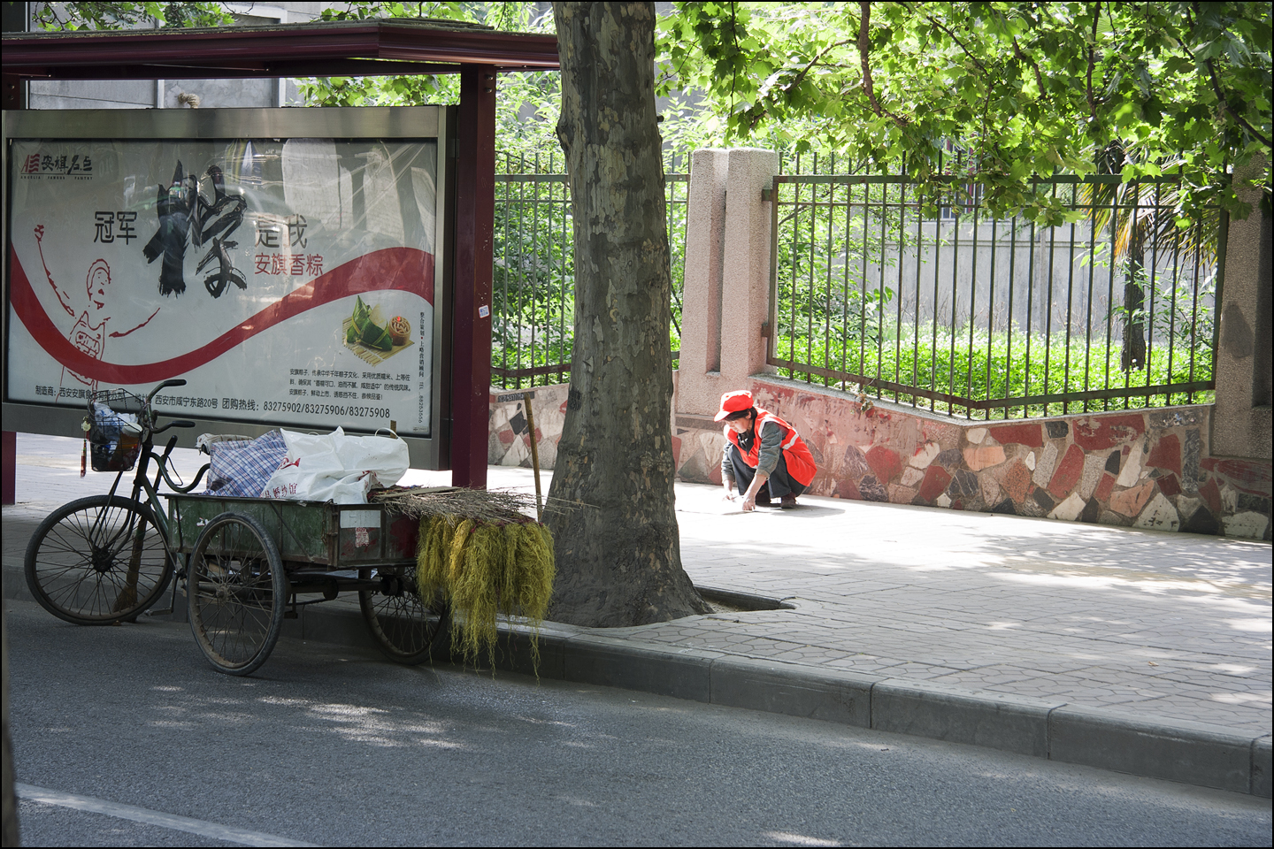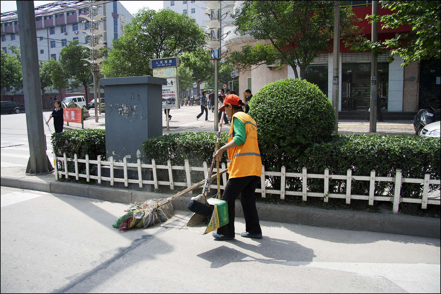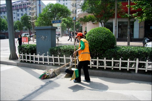 Streets and major roads are kept clean by many people with large mop-like brushes.