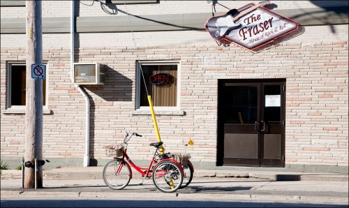 The colours of the pedicabs and the relationships among the tourists and drivers give interest here.