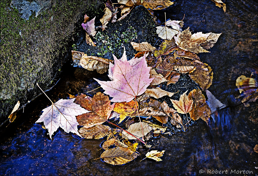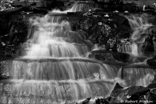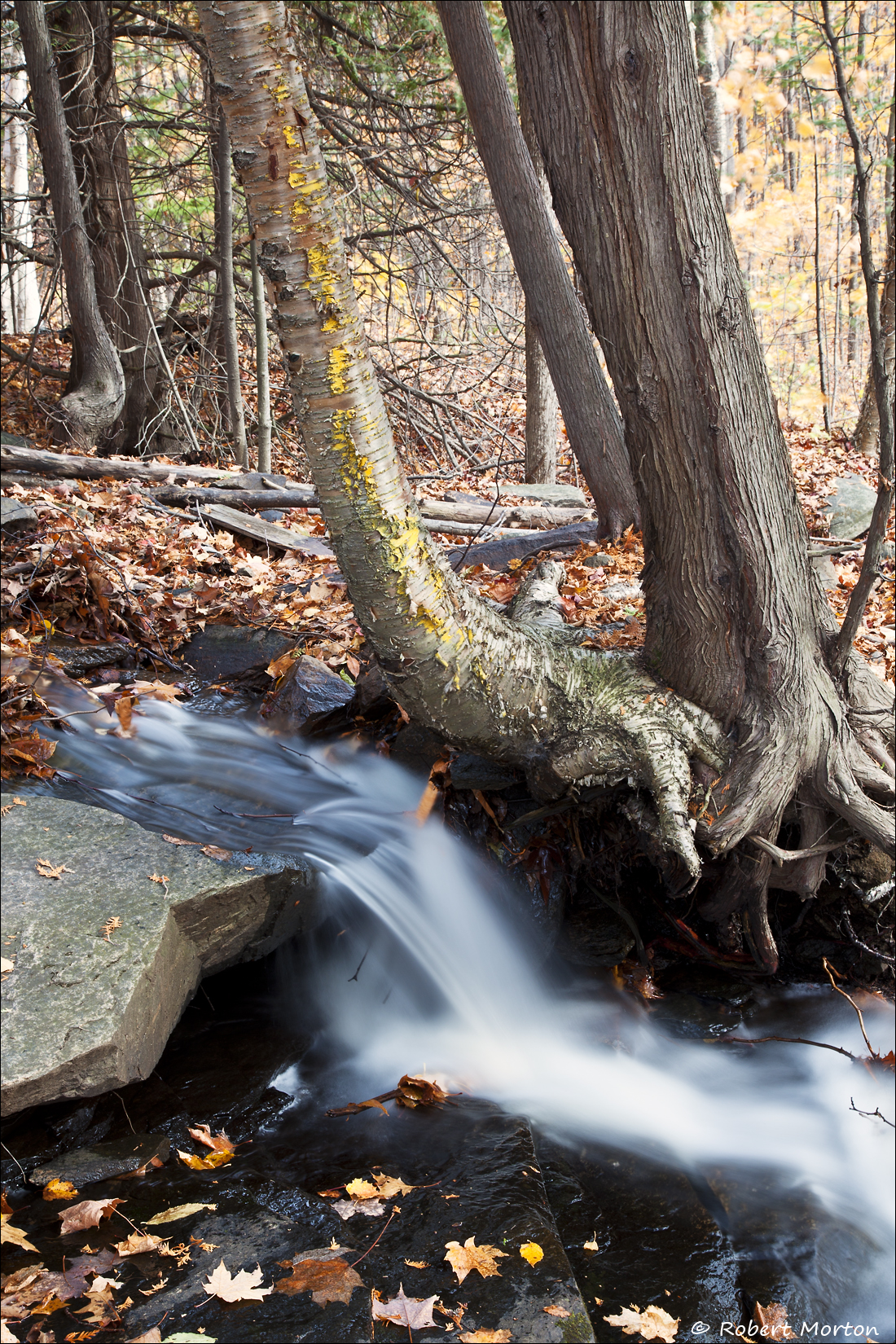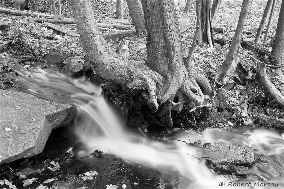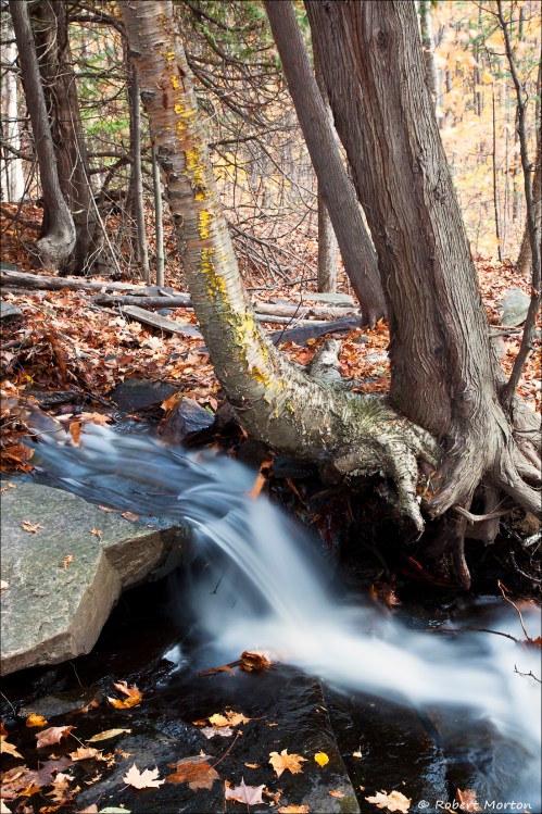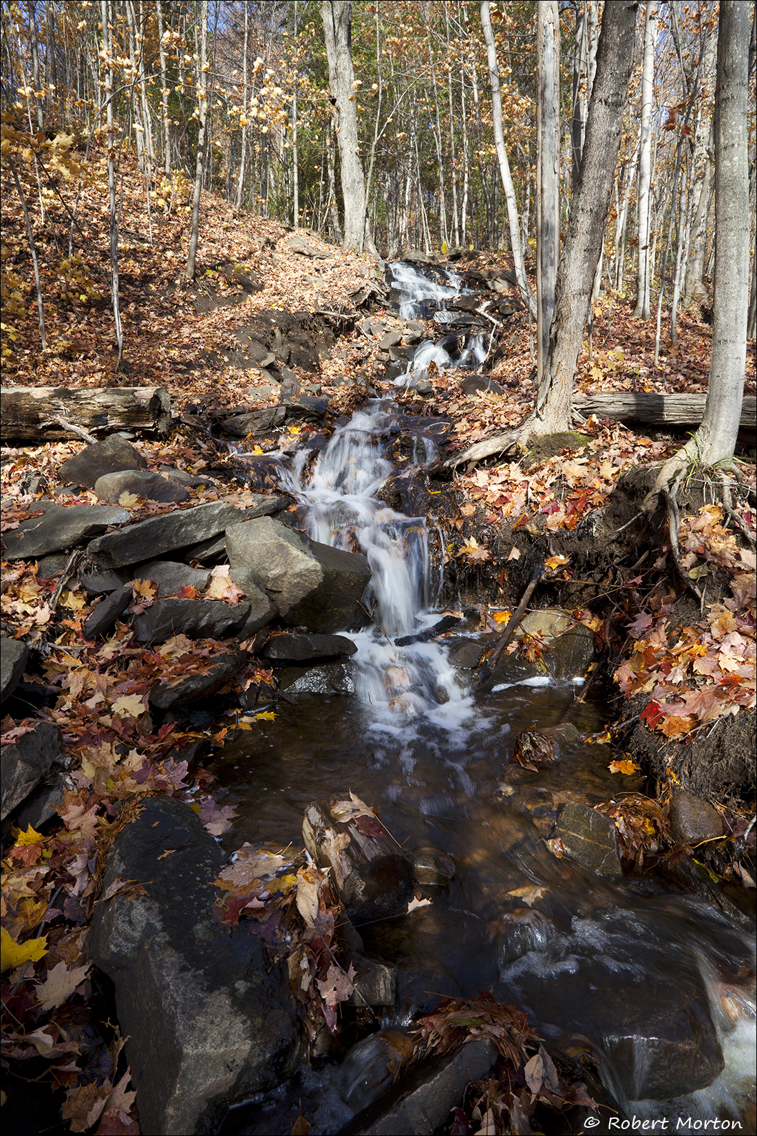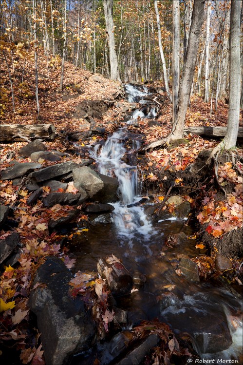 This little series of waterfalls is on a small creek that flows down the escarpment below the old Monastery in North Bay. Recent rains have provided just enough water to make a pleasant autumn scene. The trees have lost most of their leaves and the forest floor is accumulating this year’s protective covering.