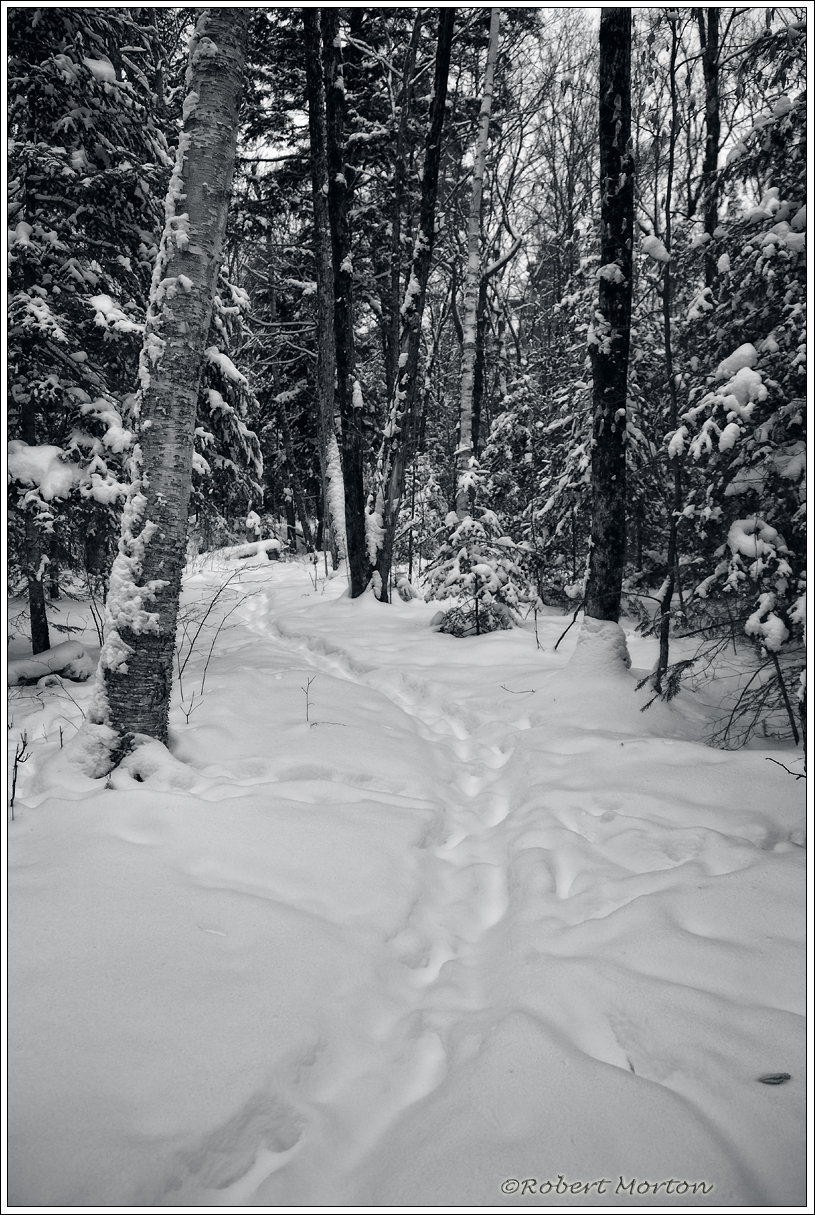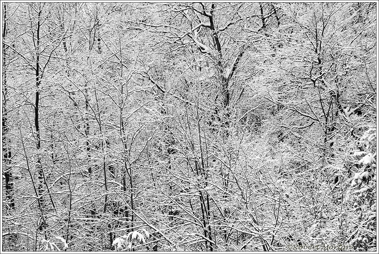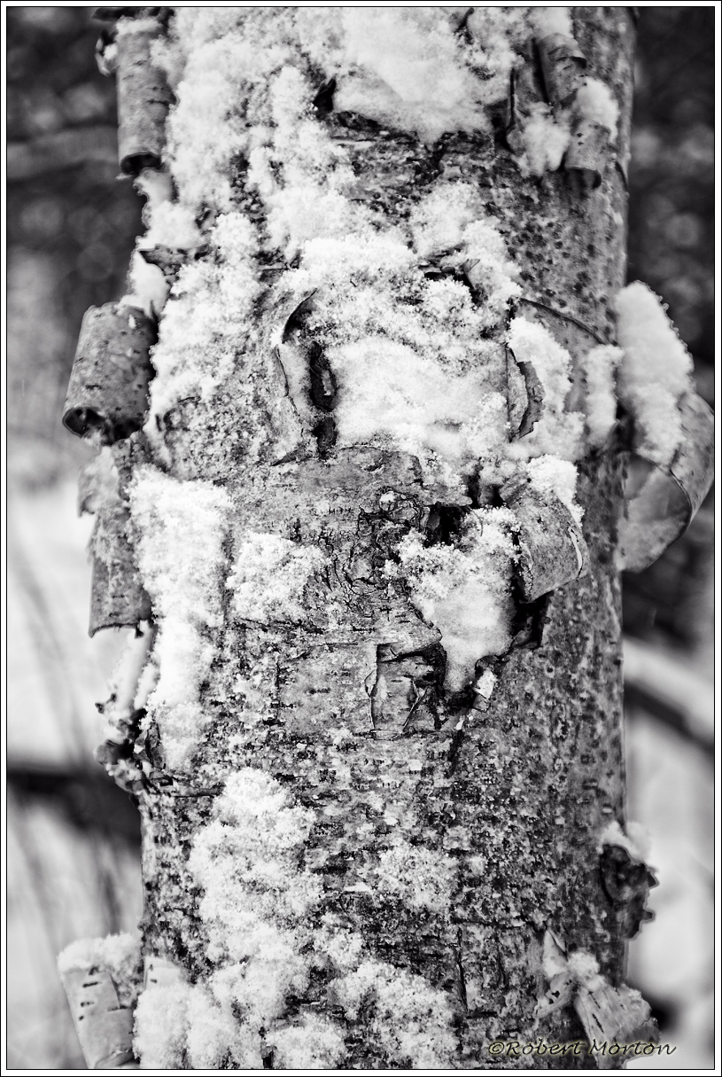 Fresh snowflakes and cracked bark make a nicely textured monochrome portrait.
