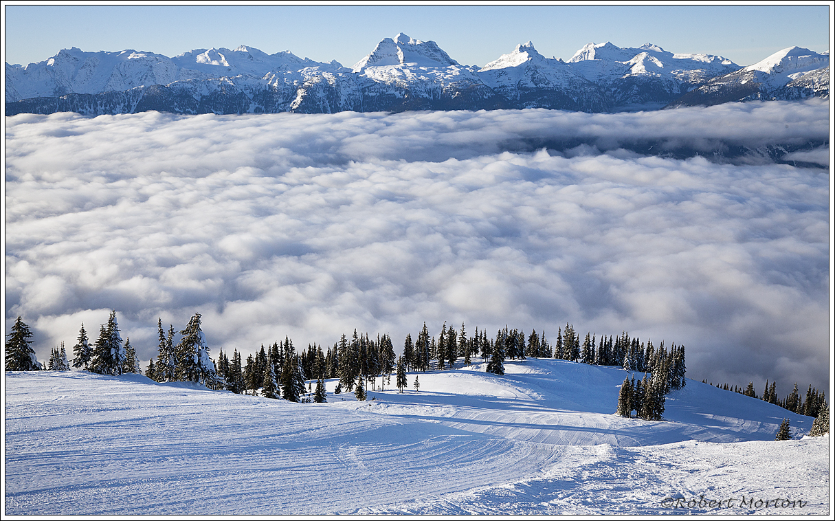 Near the top of the mountain the frost-coated trees look delicately spectacular.