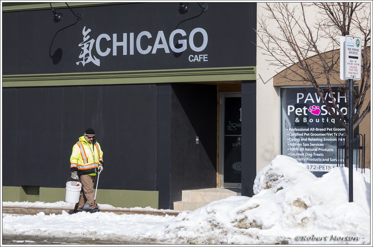 This gentleman had a pleasant job ambling around in the sunshine picking up bits of litter exposed by the slowly receding snow. We had a pleasant chat about photography after I made this photograph.