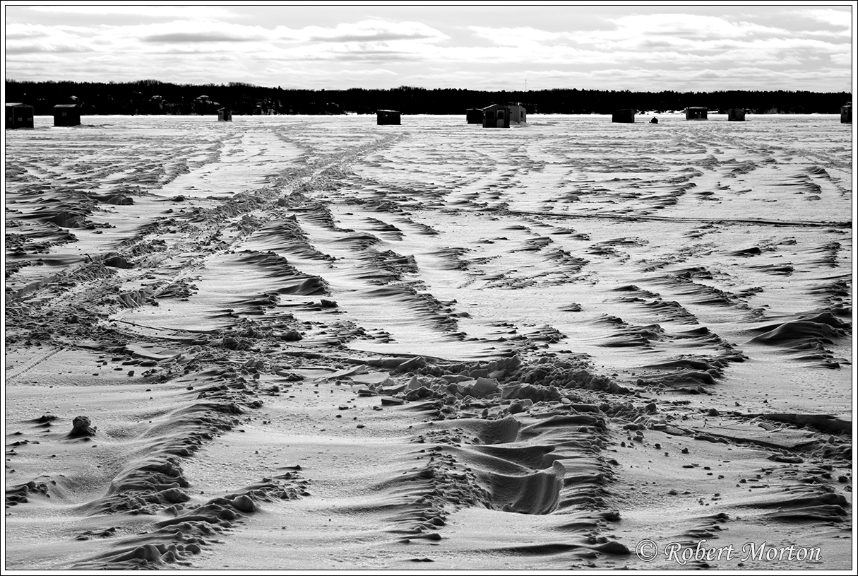 Ice Fishing huts on the Callander Bay Ice Desert of Lake Nipissing.