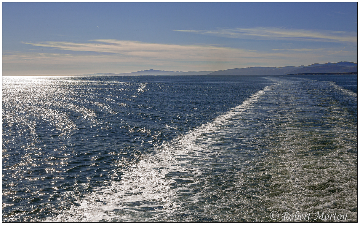 The wake of the ferry marks our passage across the Saint Lawrence River.