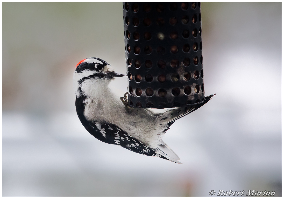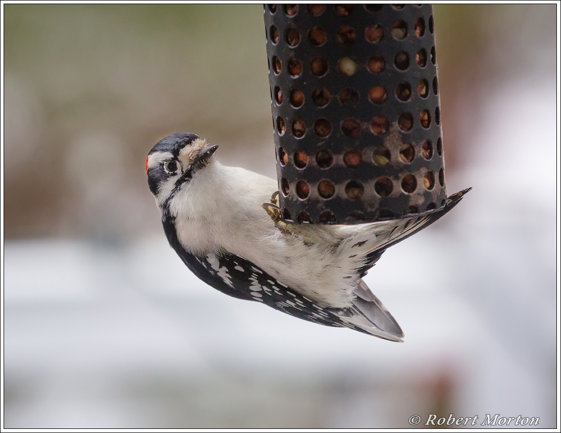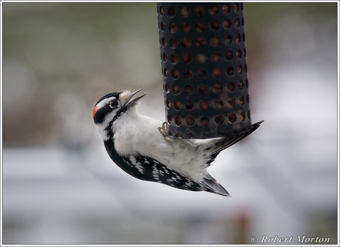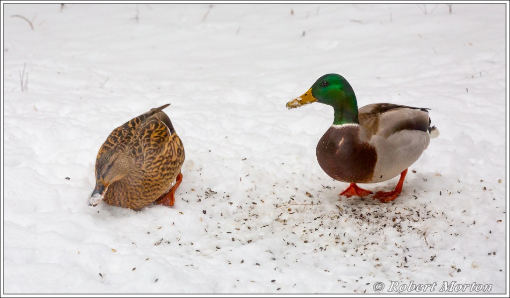 Recently a pair of Mallard ducks has been waddling up from the lake to pick through the seed pile that has formed from the messy habits of the upstairs inhabitants at the feeder.