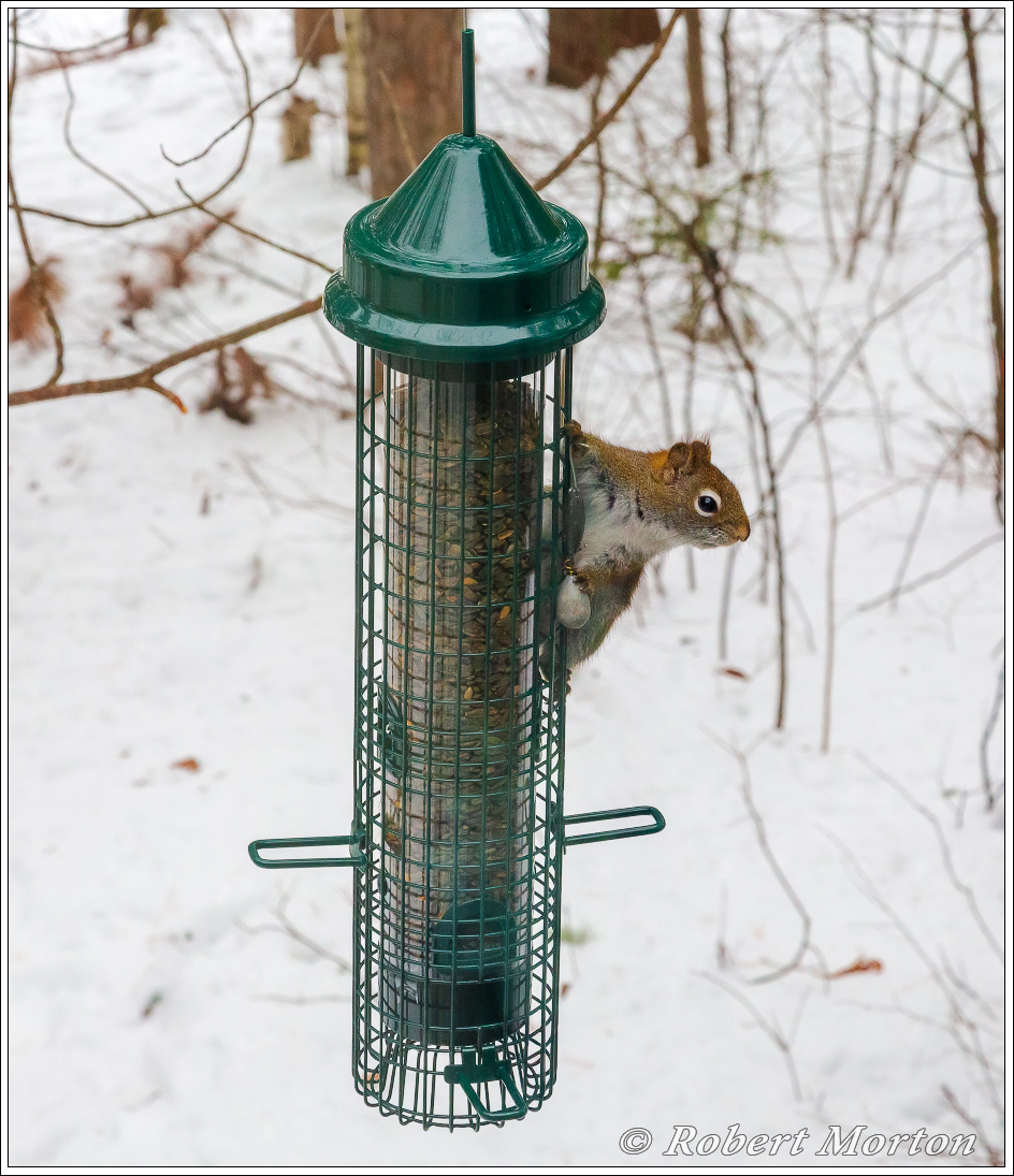 A “Squirrel Proof” bird feeder that foils the most optimistic of Red Squirrels.