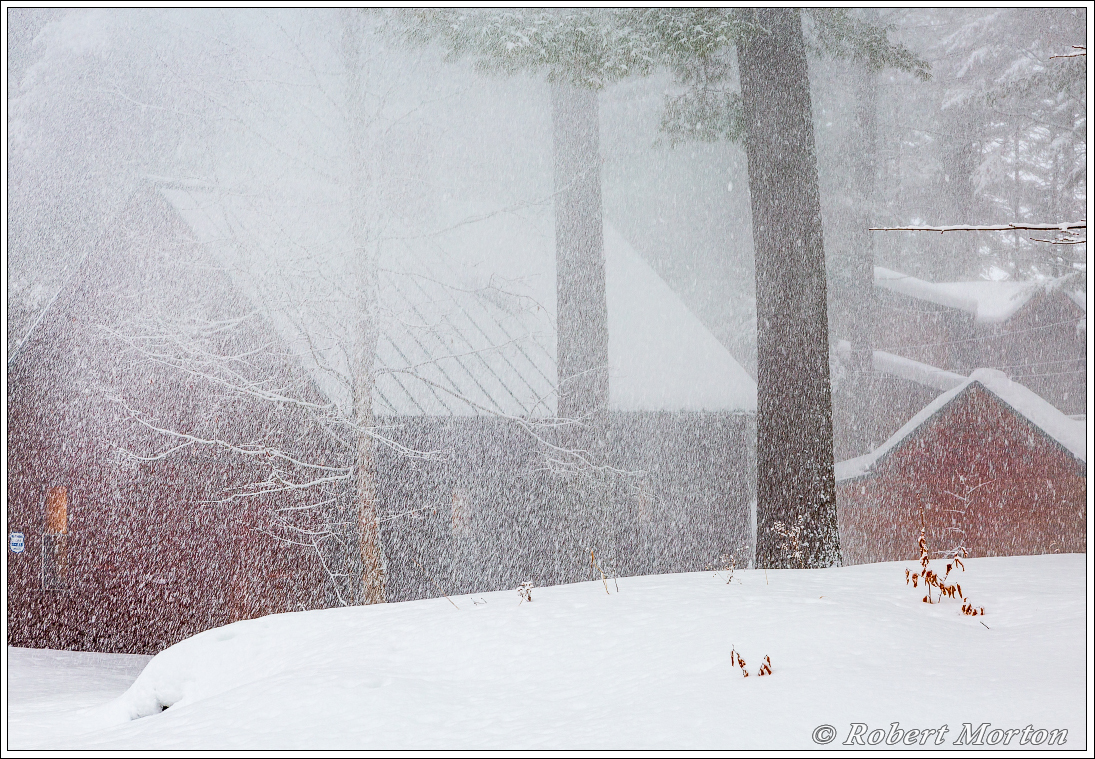 A wild flurry of activity engulfs a calm collection of buildings and trees.