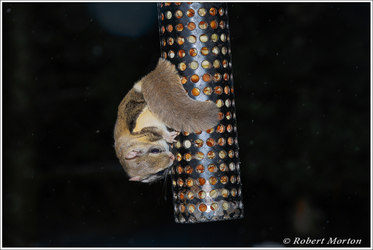 On Christmas Night, a flying squirrel flew onto the bird feeder.