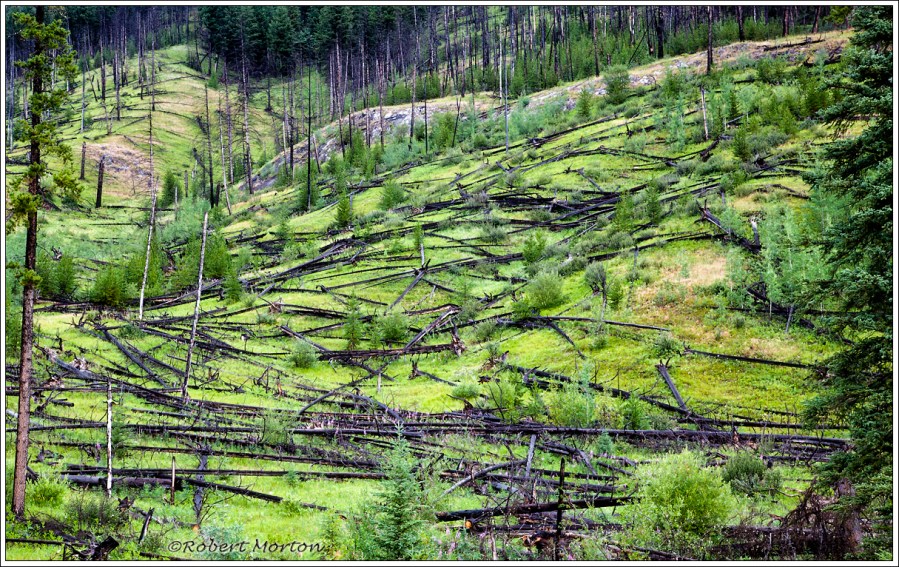 1993 controlled burn beside the Bow River Parkway in Banff National Park. Slowly regenerating habitat.