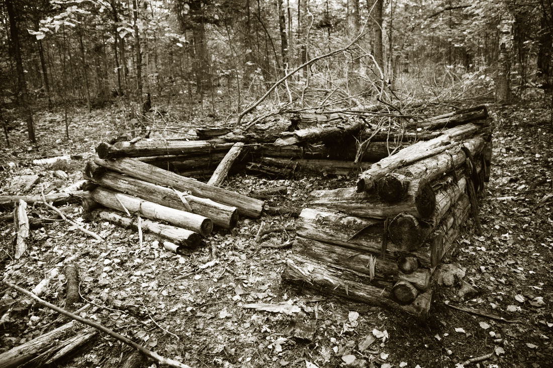 This trappers cabin is near our place. The roof is long gone but when it was built it was quite cozy and functional inside. The friend who owns the land built it in 1972 with the aid of a French Canadian wood carver of his acquaintance as an exercise in woodcraft. It served his children as a memory maker and fun place to be.