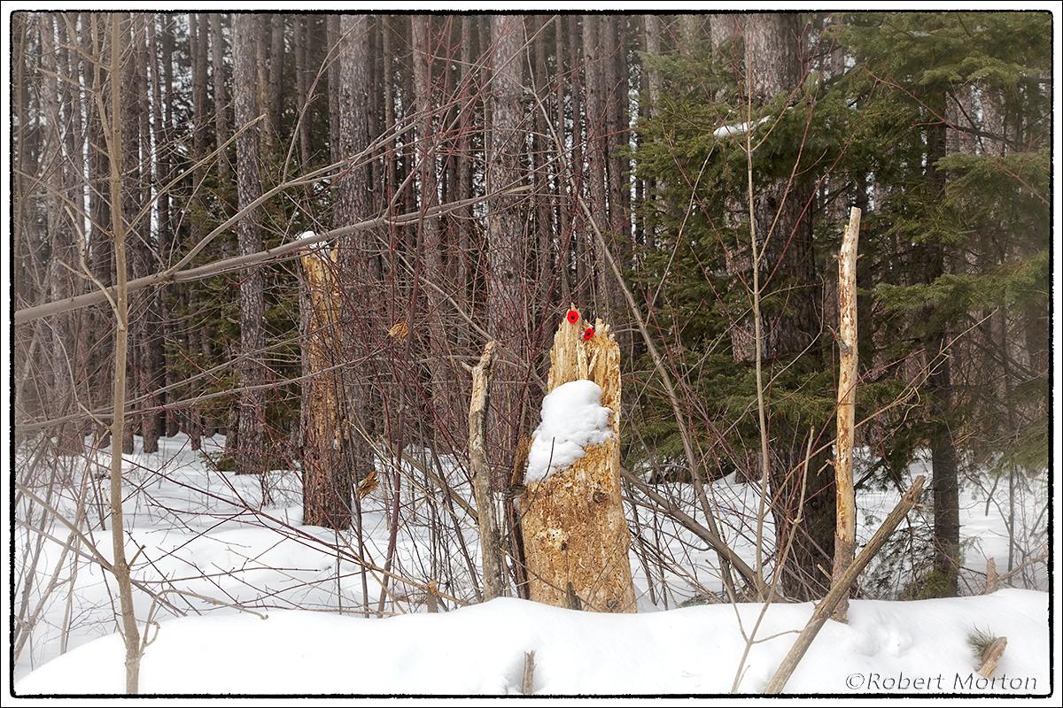 Two Remembrance Day poppies have been placed in the stump of a fallen tree at the corner of West Peninsula and Peninsula Road. They have been there since November. I photographed them today and treated the photo in different ways.