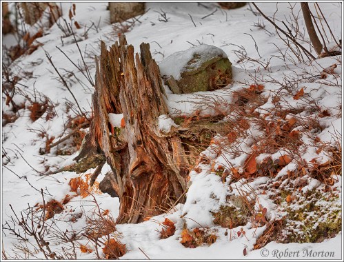 The stump has charred areas which are evidence of a forest fire that passed through this area some years ago.