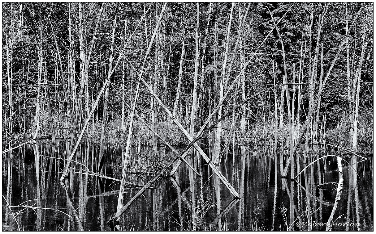 Tagged as black and white, dead, monochrome, poind, reflections, trees, trunks, water